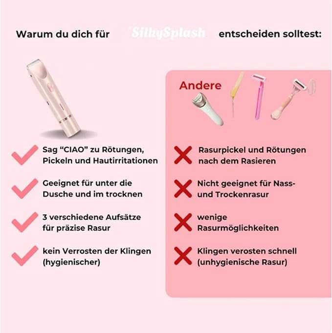 - The perfect shave - Smooth smooth: With the SilkySplash razor, you can tailor your shave exactly to your needs. The trimmer tip gently cuts hair to desired length, while the smooth tip ensures silky smooth skin without hair. Thanks to its skin-friendly technology, the shaver is suitable for all areas of the body, whether it be legs, armpits or sensitive areas. Maximum accuracy, exactly as you want